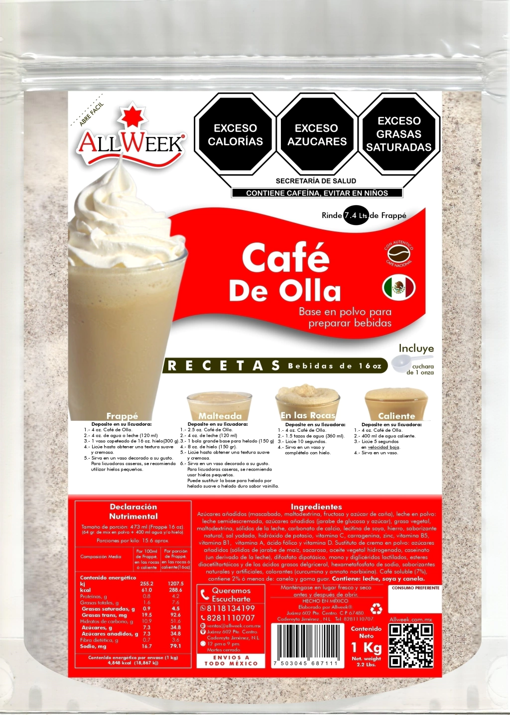 Base en polvo para preparar deliciosas bebidas de café nacional, con un toque de canela natural y piloncillo y con excelente consistencia y estabilidad.